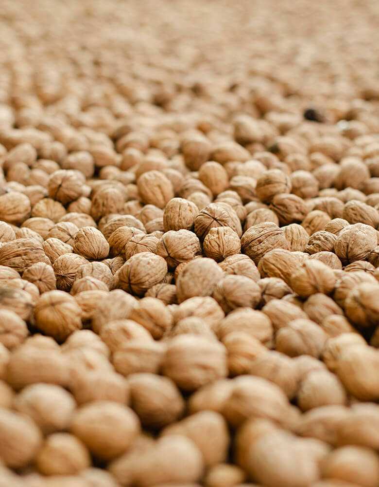 The outer green husk is removed by a huller and the nut is mechanically dehydrated (air-dried) to the optimum 8 % moisture level. This prevents deterioration of the nut and protects its quality during storage. Walnuts are stored until needed for cracking. California walnuts are protected from contamination because of the nut’s double envelope of hull and shell while on the tree.